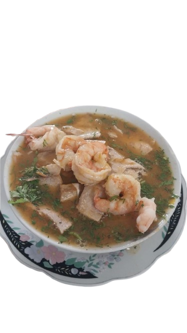 Deliciosa y tradicional sopa ecuatoriana de pescado, yuca con camarones.