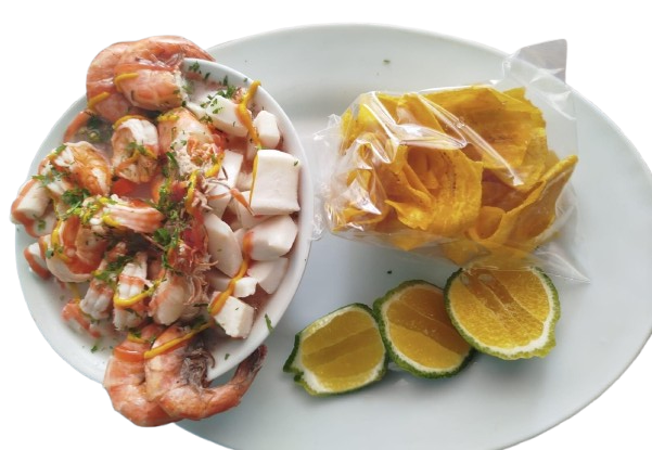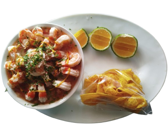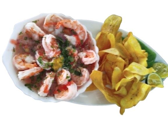 1lb de camarones frescos cocidos y jugosos, sobre una base de jugosa ensalada , servidos con chifles