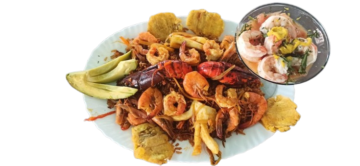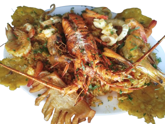 Lujoso y potente arroz de mariscos con : Camarón-Calamar-Pulpo-Pescado-Langostinos -Langosta, acompañado de aguacate, patacones y un ceviche extra.