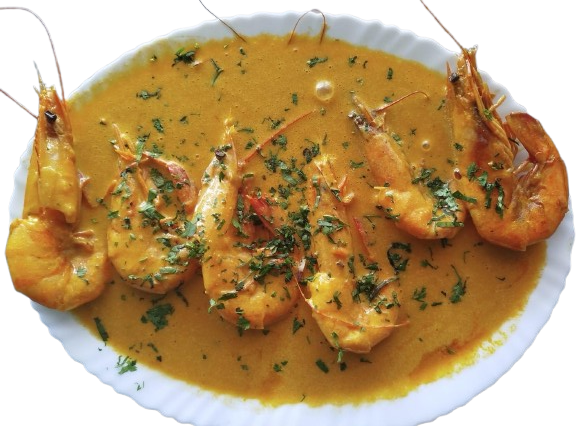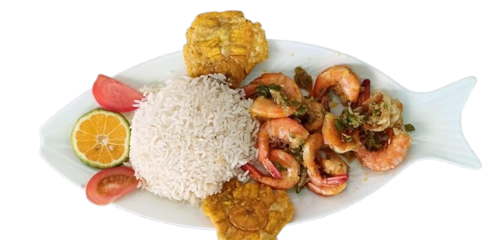 Jugosos langostinos (1lb) bañados en una deliciosa salsa cremosa de coco, acompañada de porción de arroz y patacones