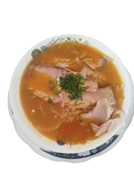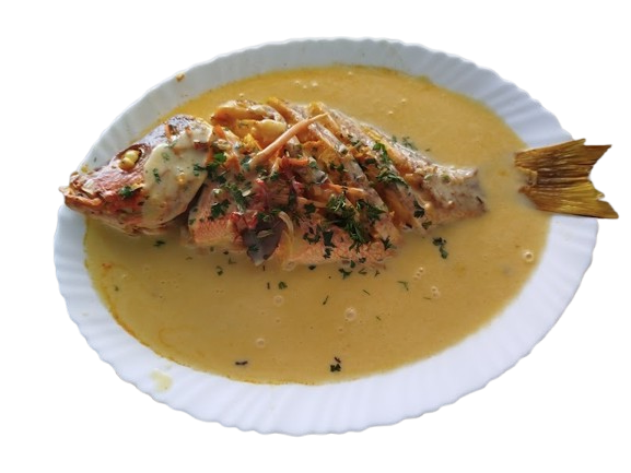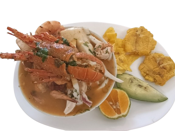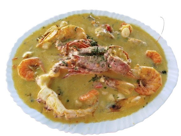 Potente, sabrosa sopa ecuatoriana de pescado, yuca, cebolla , acompañada de: Camarón-Calamar-Pulpo-Pescado-Langostinos -Langosta.
