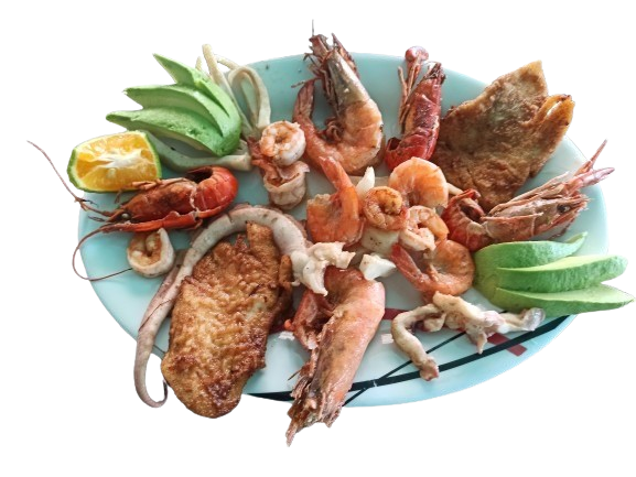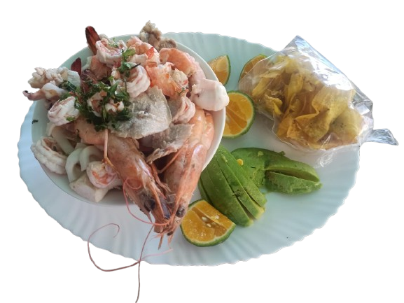 Espectacular mezcla de mariscos: Camarón-Calamar-Pulpo-Pescado-Langostinos -Langosta, servidos con aguacate y chifles.