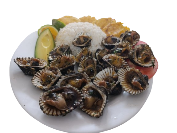Conchas ahumadas y jugosas, cocinadas a la parrilla, acompañadas de arroz, patacones.