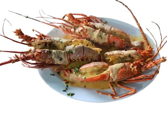 Lujosas y enteras langostas cocidas en una intensa y sabrosa salsa de mantequilla, ajo, acompañada con porción de arroz y patacones.