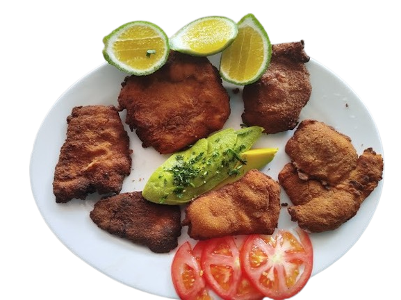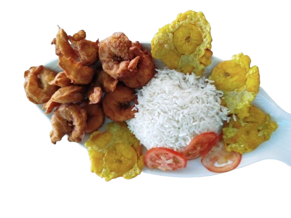 Camarones fritos con apanadura, acompañado de arroz blanco y patacones.