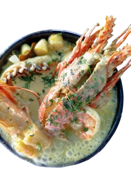 Sopa cremosa, aromático de mariscos: Camarón-Calamar-Pulpo-Pescado-Langostinos-Langosta, cocidos a base de coco.