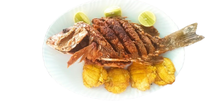 Pargo entero de 1kl frito y crujiente, servido con patacones y porción de arroz .