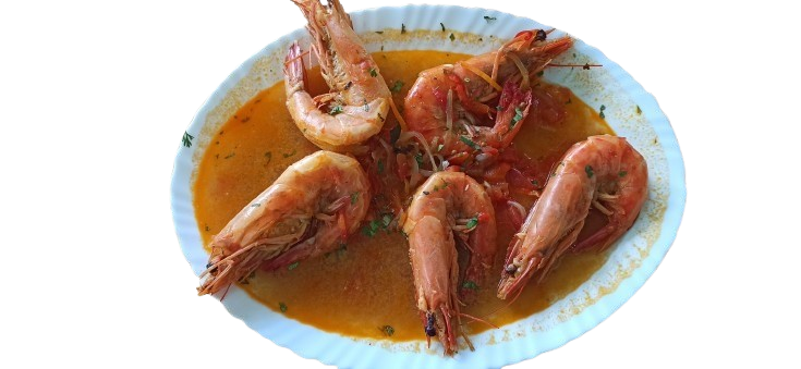 Langostinos cocidos en una salsa aromática de ajo, acompañado de porción de arroz y patacones.