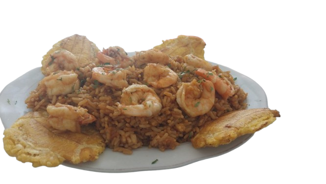 Clásico arroz sazonado, cocinado con camarones , acompañado de patacones.